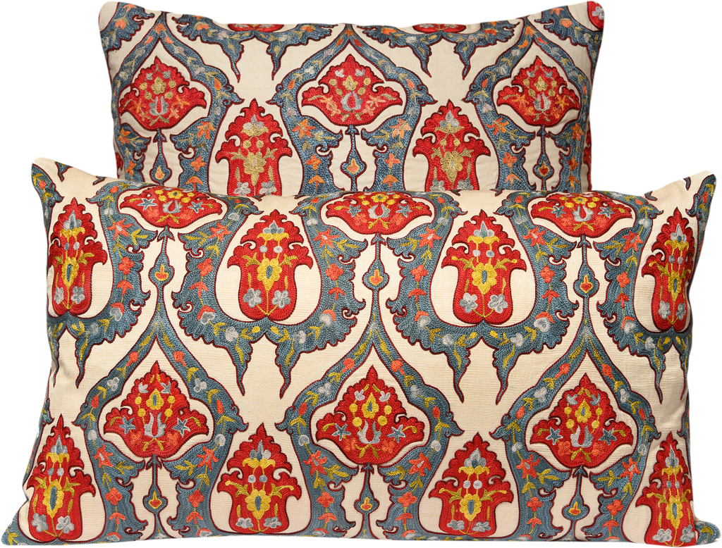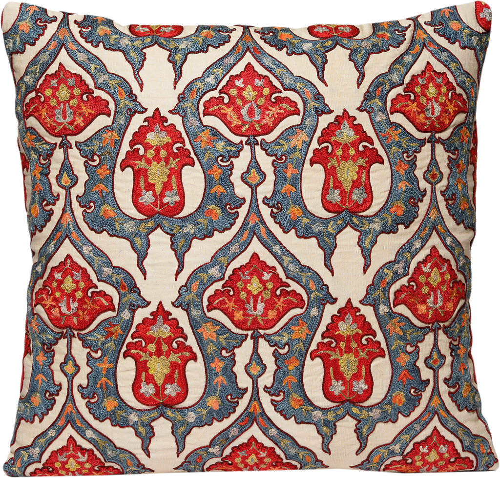 Our luxurious embroidered Red Tulips cushions have been inspired by original design motifs of Uzbek Suzanis that have been individually hand-embroidered onto the hand-woven silk-cotton fabric.