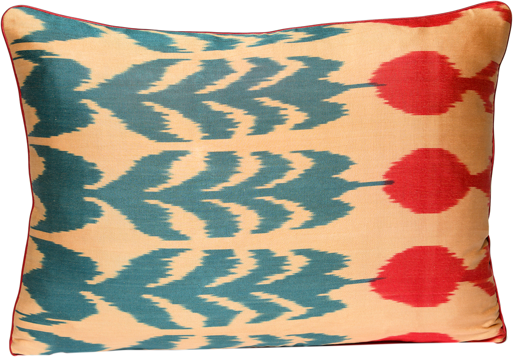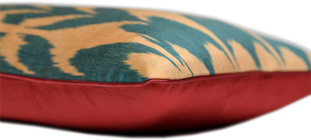 To create our beautiful Red Tulips Silk Ikat cushion, we use hand-woven and hand-dyed fabrics known as Ikat materials. In Uzbekistan the Ikat technique is called Abrband, which is an ancient way of creating designs in fabric by resist-dyeing the threads before the fabric is woven. This technique produces a distinctive vibrancy of colour and design.
