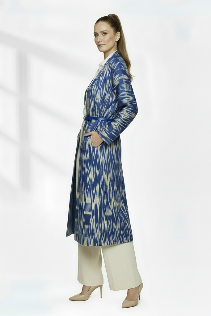 Each coat is meticulously crafted from hand-woven ikat fabric and with a 100% silk lining ensures a wonderfully luxurious wear. We have adapted the design to be more tailored in a modern style to create a truly stunning coat for contemporary living. The adjustable cuffs and belt allow for various styling options, adding to its versatility.