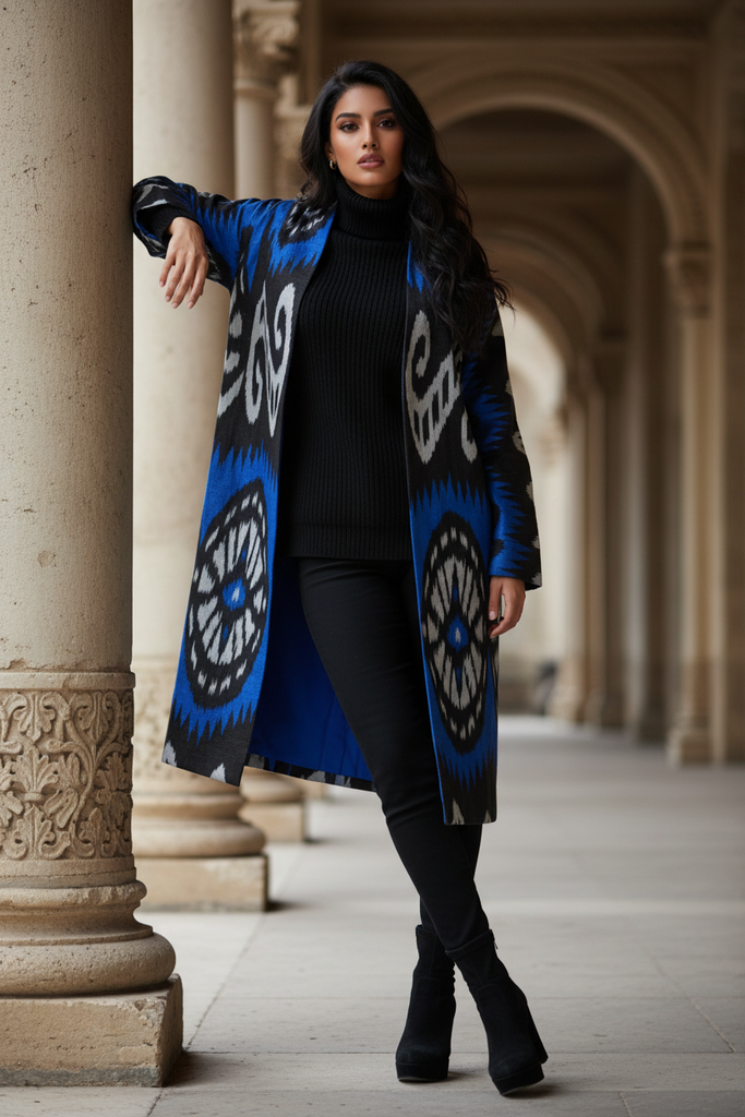This beautiful Sitora Silk Ikat Coat is inspired by the traditional Uzbek chapan - an outer robe made of silk and cotton. We have adapted the design to be more tailored in a modern style to create a truly stunning coat for contemporary living. The exquisite fabric is hand woven and hand embroidered in a stunning range of colours with a 100% cotton lining that ensures a wonderfully luxurious wear. This flattering coat can be worn over anything to create an instantly sophisticated look.