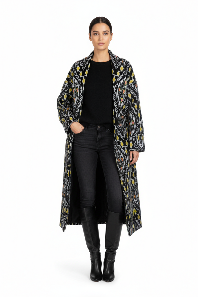 This limited edition Nigora shawl coat was created from our exquisite Bhakmal silk velvet fabric. Bakhmal is a masterpiece fabric within the Abra (Ikat) family which is handwoven in a traditional technique in Uzbekistan. This stunning piece creates timeless elegance that will be treasured by those who own it.