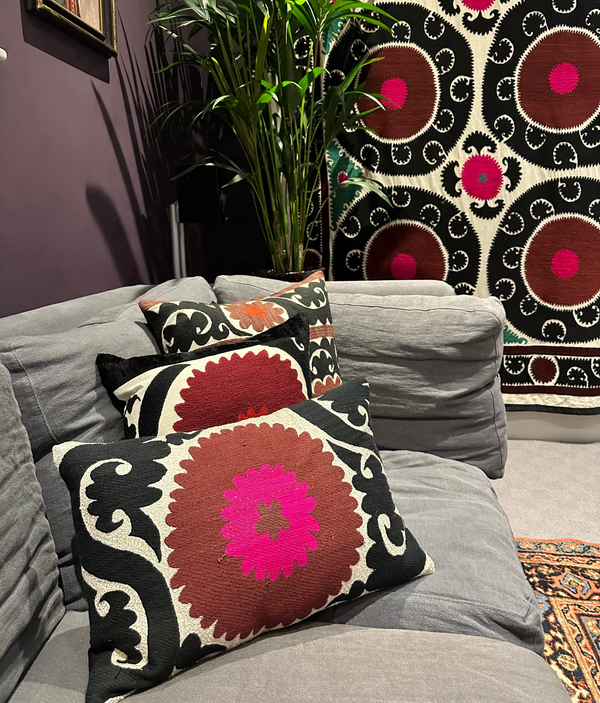 Vintage Suzani Cushions are individually handcrafted from hand-embroidered vintage Suzanis from Samarkand. The suzanis were traditionally created as beautiful, handcrafted dowry pieces that the women in a family laboriously created together and presented to the bride on her wedding day. The designs are rooted in ancient beliefs, and the motifs have magical meanings that are believed to drive away evil spirits. In sourcing the vintage fabrics for these cushions, the artisans select the highest quality pieces in order to create these beautiful cushions.