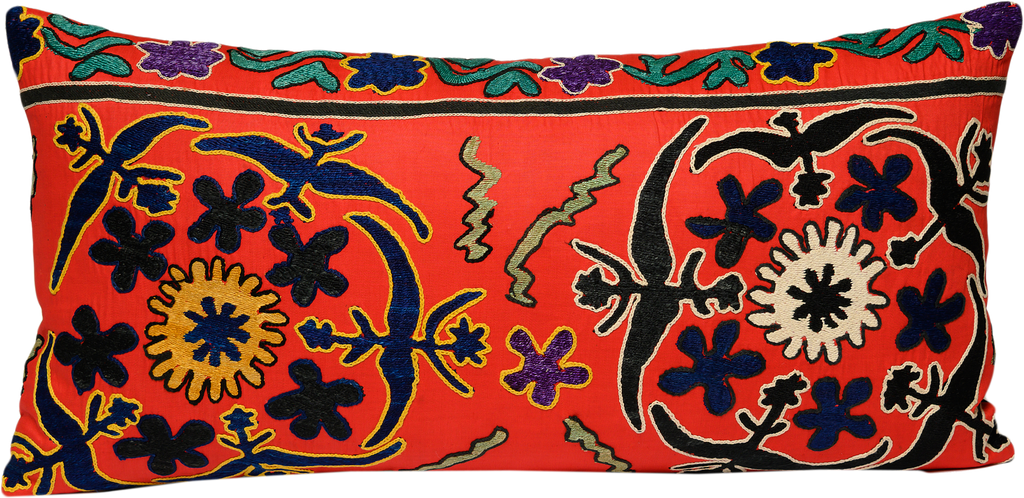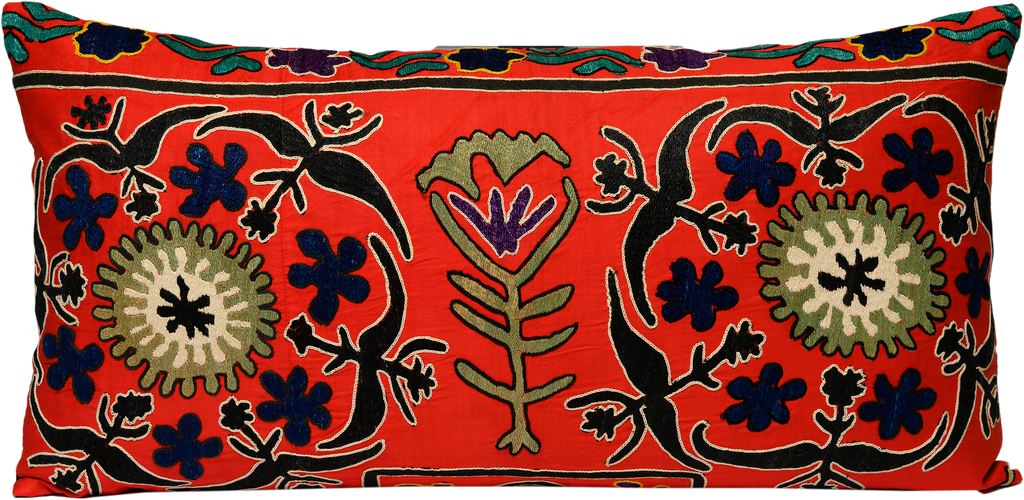 Vintage hand-embroidered Suzani cushion Carnelia is created from carefully sourced antique Suzani textiles and designed as a bold statement for the home. Traditionally made as ceremonial dowry pieces, Suzani embroideries were crafted by women over time, carrying symbols of protection, balance and abundance.