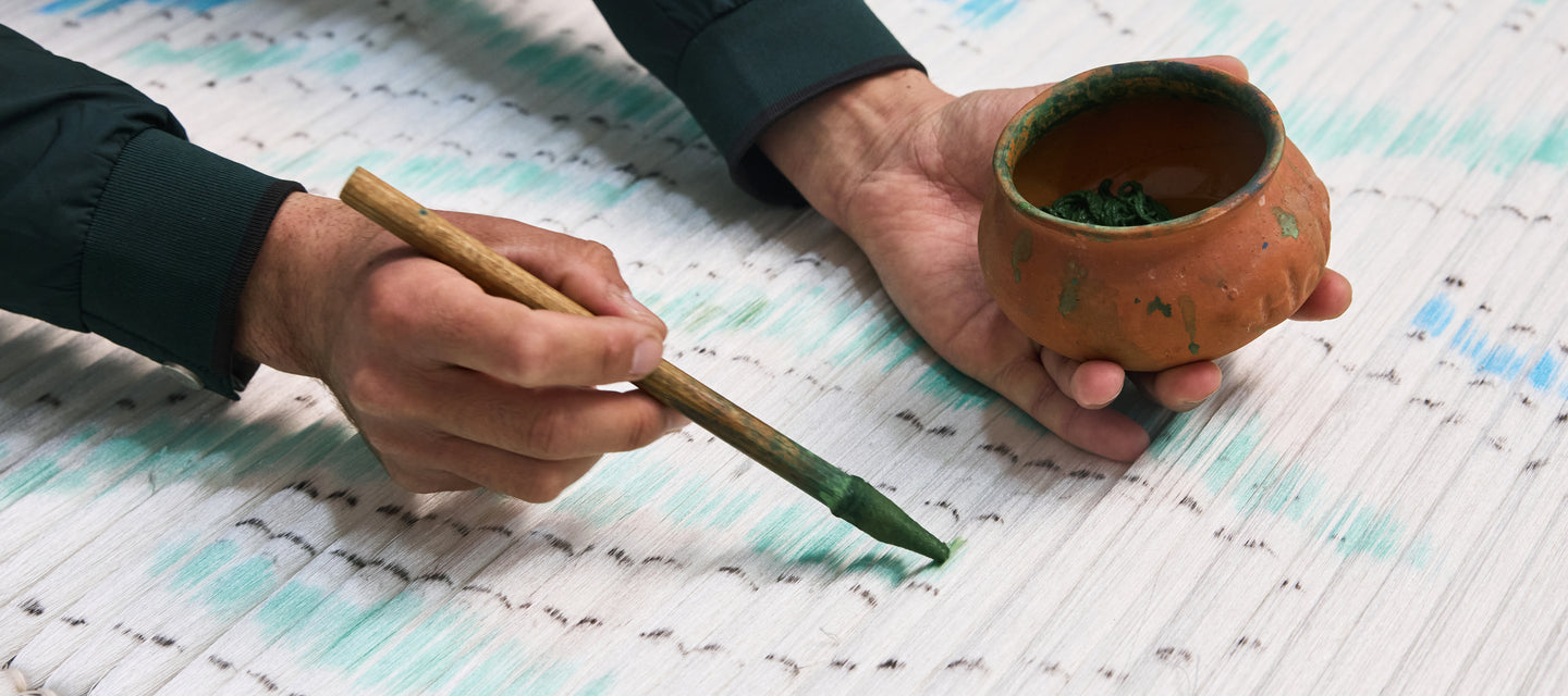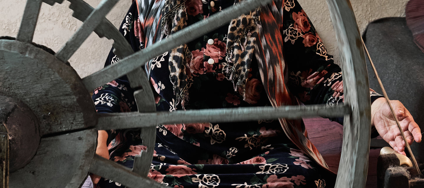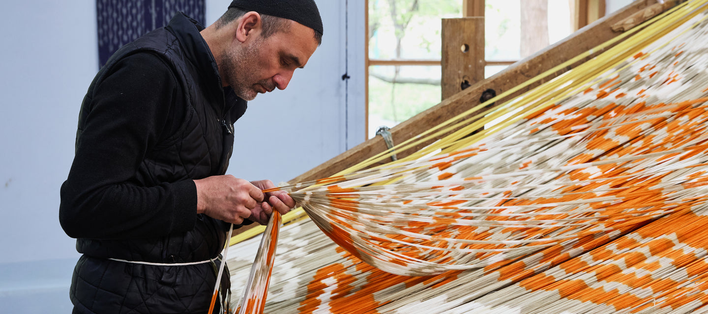 The word Ikat in the English language ultimately derives from Malay. It is a very ancient way of creating designs in fabric by resist-dyeing the threads before the fabric is woven. In Uzbekistan, Ikat is known as Abrband from the Persian “abr” - a cloud and “bind” – to tie – fabrics produced by this method are known as Abra fabrics.